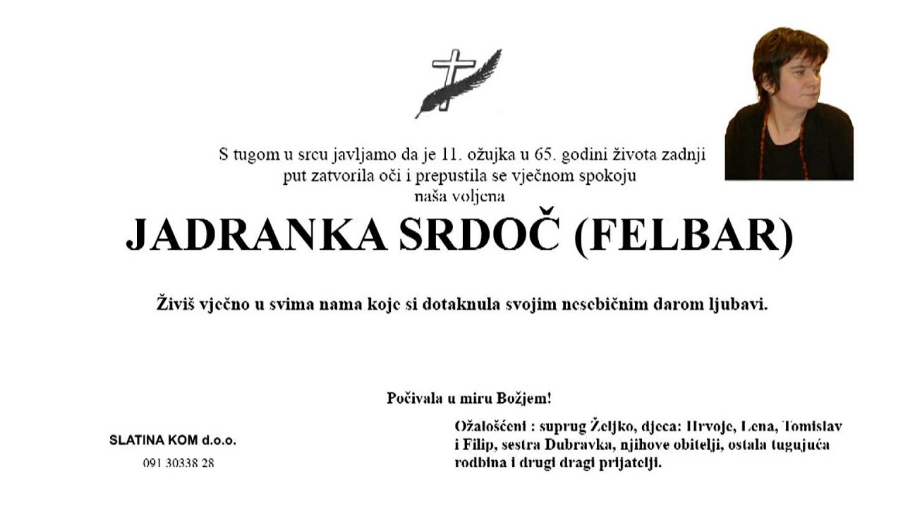 Posljednji ispraćaj Jadranke Srdoč Felbar je u ponedjeljak 15. ožujka 2021. godine u 14 sati na slatinskom groblju. Pomolimo se svi zajedno ! Počivala u
